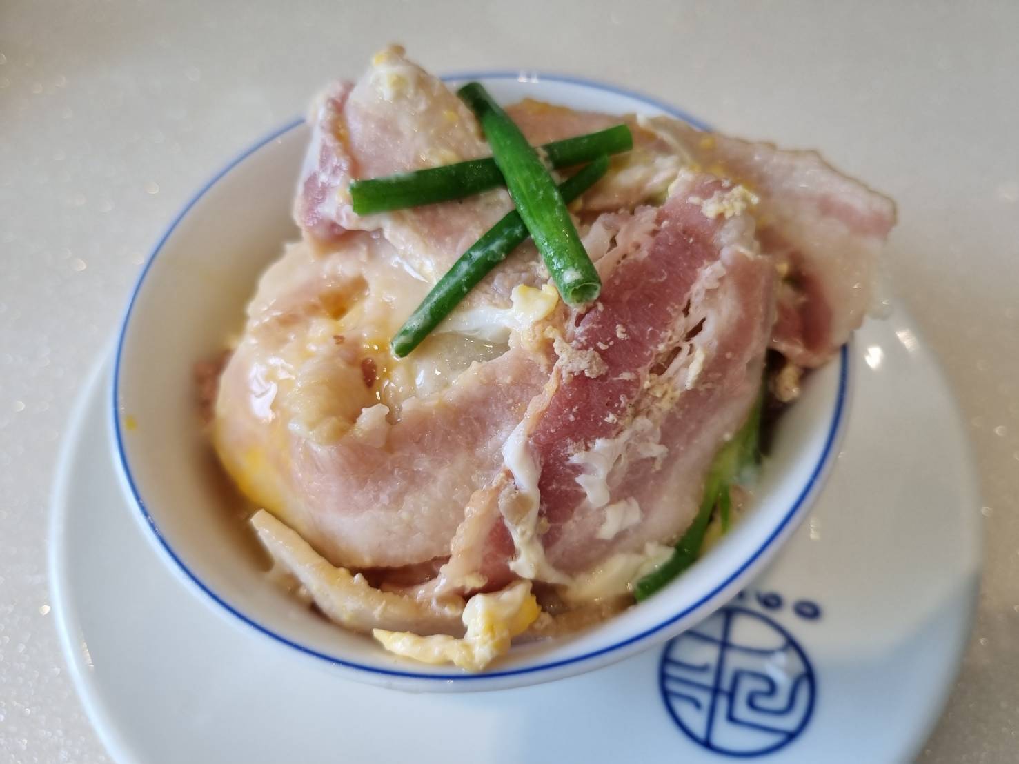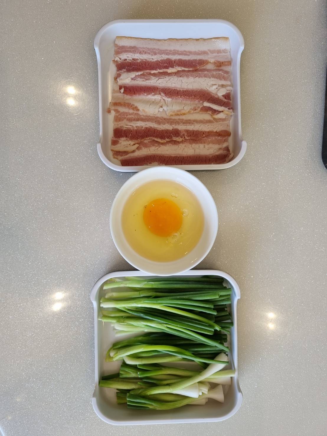 ลวกเบคอนให้แผ่ๆ ในตะกร้อสุกี้ พอสุกได้ที่ก็ใส่ต้นหอมและไข่ รวนไม่ให้ไข่สุกมากประมาณเดียวกับไข่ลวกที่เรากินกัน แล้วก็โปะลงบนข้าวสวยเลยค่ะ เป็นข้าวไข่ข้นที่ดีงามมาก