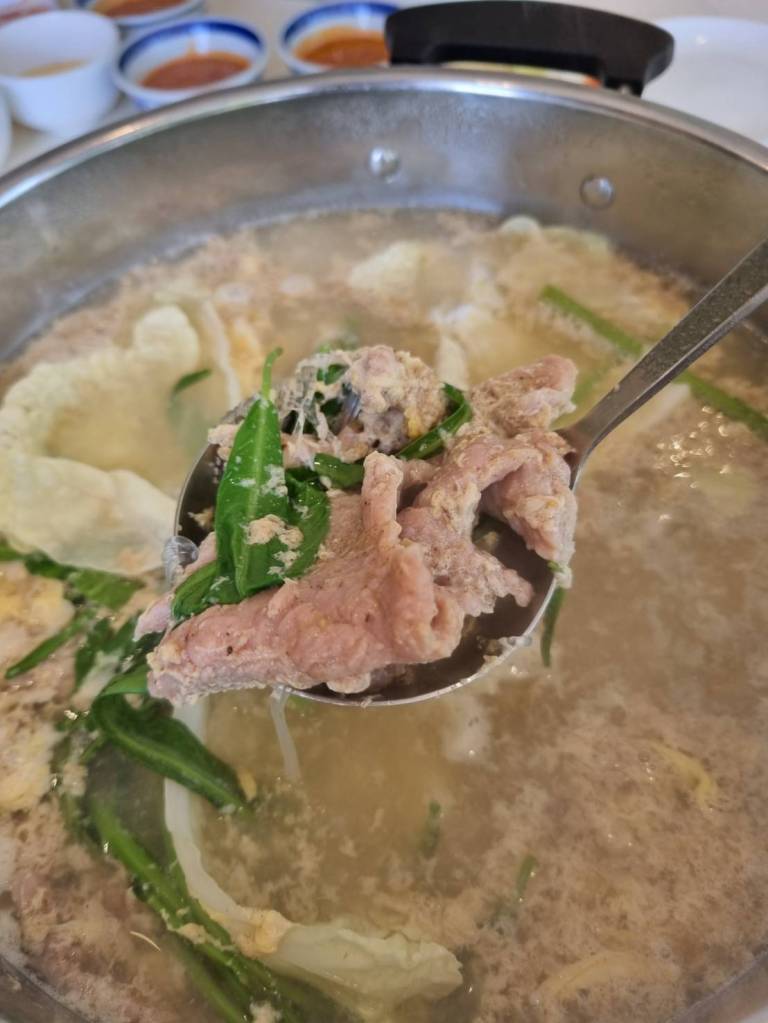 หากคุณเปิดเมนูหลักของร้านคุณจะหาบะหมี่เกี๋ยวไม่เจอค่ะ แต่ของดีอยู่ในหน้าของเครื่องสุกี้ต่างหาก เราขอแนะนำให้คุณสั่ง บะหมี่ เกี๋ยวกุ้ง ลูกชิ้นกุ้งและผักไต้หวัน